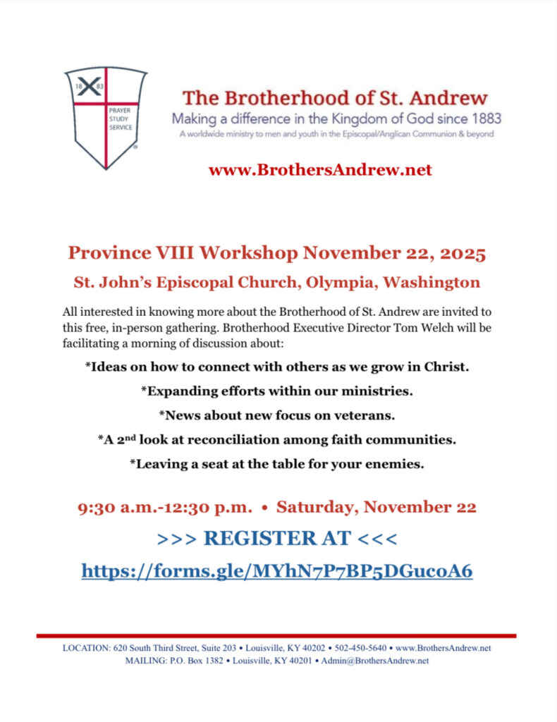 All interested in knowing about the Brotherhood Of Saint Andrew are invited to this free, in person gathering. Brotherhood Executive Director Tom Welch will be facilitating a morning discussion.