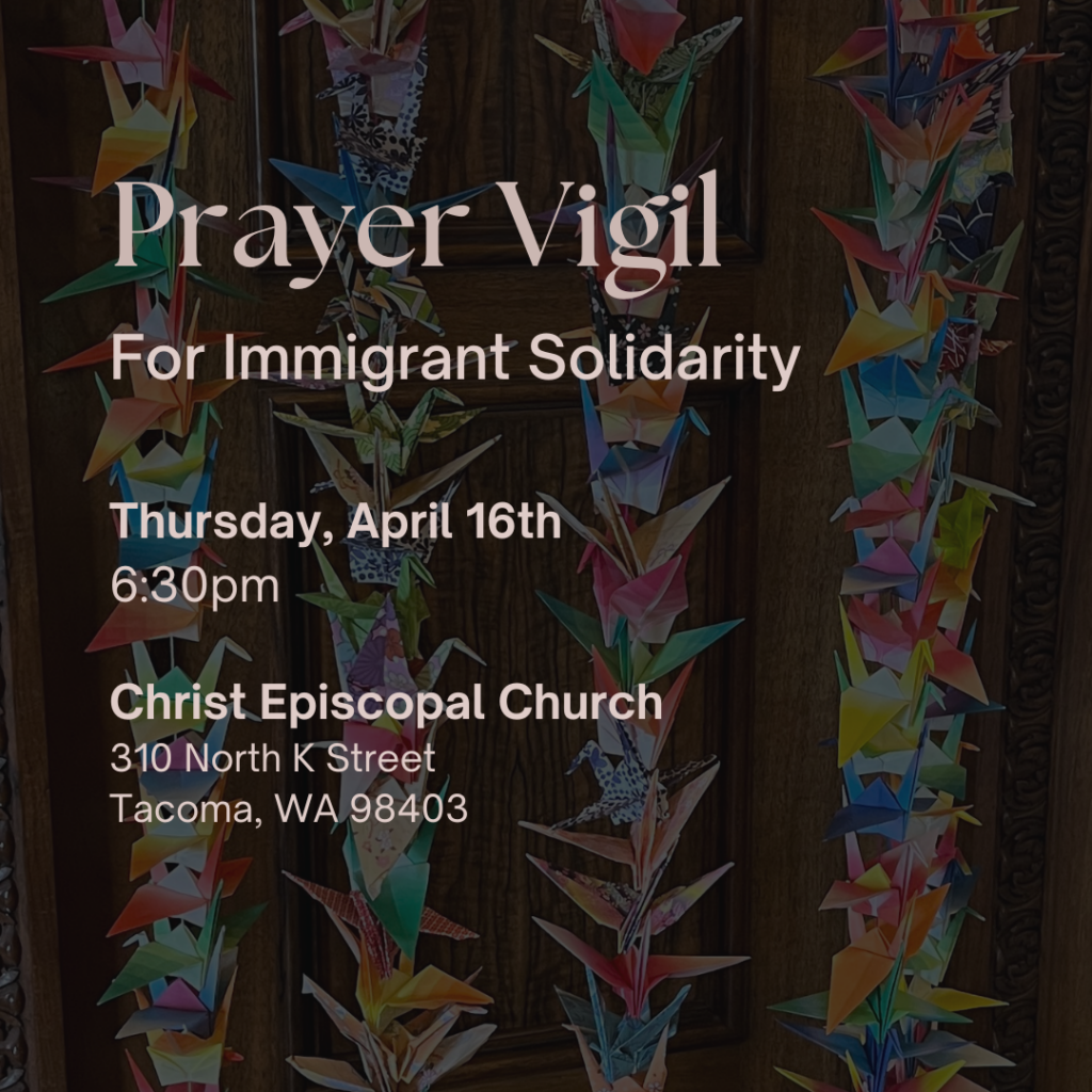 All are welcome to join the retreat’s prayer vigil at Christ Church, Tacoma. We will hear from community organizers, listen to testimonies from detainees, and pray together. We will also have a chance to fold tsuru or Japanese cranes as symbols of hope, peace, and compassion.