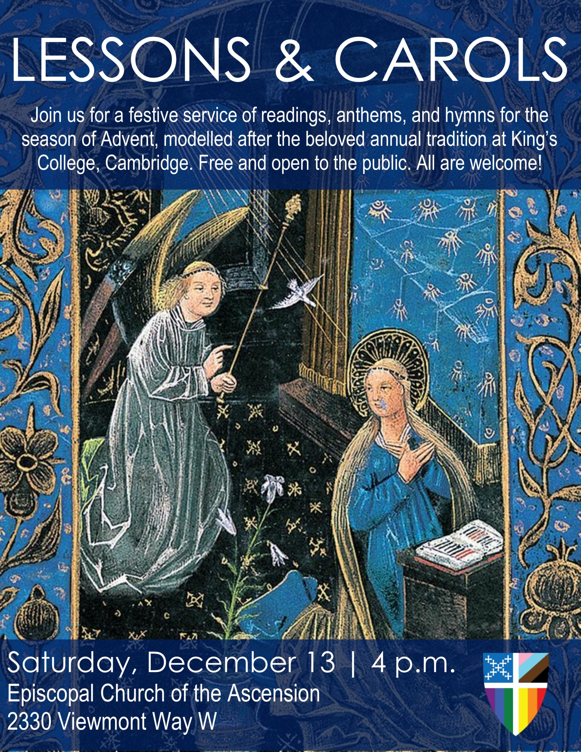 An annual favorite in Tacoma, the St. Luke's Chancel Choir sings a service of Advent Lessons & Carols featuring organ and choral works by Mark Schweizer, Thomas Ravenscroft, John Ferguson, Henry Ley, Charles Villiers Stanford, T. Tertius Noble, Adolphus Hailstork, and Brenda Portman.